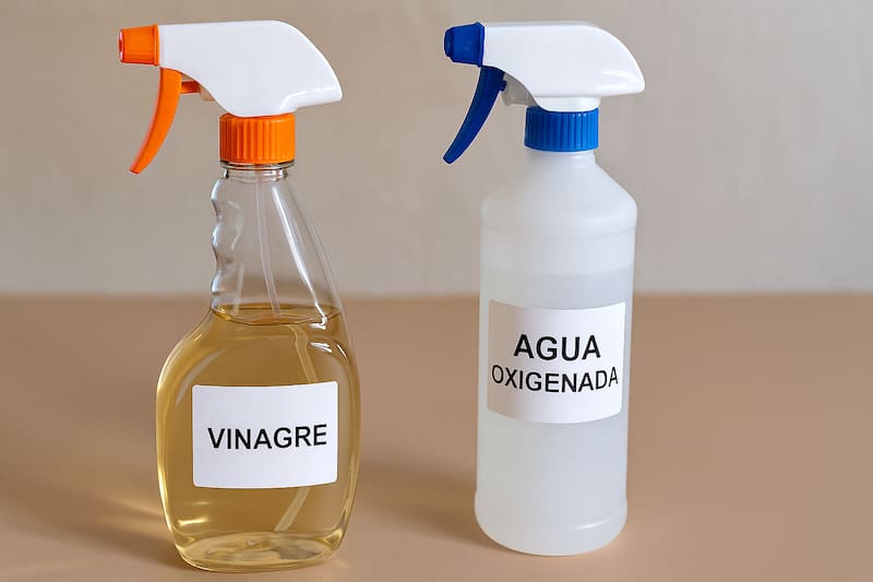 - Preparar dos rociadores separados: uno con vinagre blanco y otro con agua oxigenada al 3%.