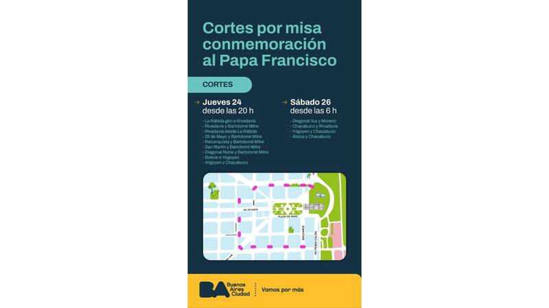 De acuerdo al Gobierno de la Ciudad de Buenos Aires, la misa por el papa Francisco provocará que estas calles estén cerradas durante esta jornada: