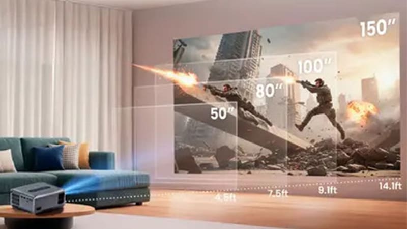 Este proyector tiene la capacidad de aumentar el tamaño de la imagen de 45″ a 300″, según la distancia en la que esté el sofá o el punto de vista.