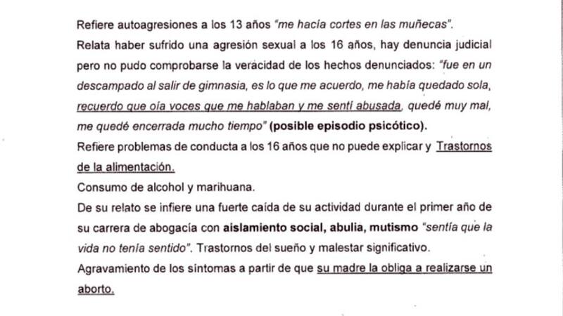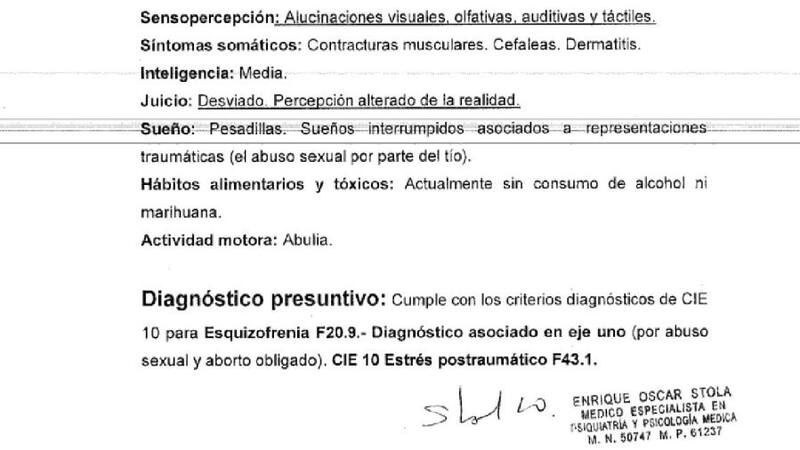En el informe que no fue tenido en cuenta por la Justicia se detalla que la acusada cuenta con una esquizofrenia de inicio temprano y poseealucinaciones "muy presentes" de carácter auditivo, visual, cenestésico y olfativo.