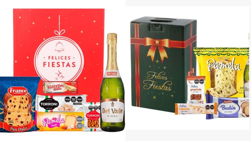 Incluyen productos clásicos como pan dulce, budines y turrones, y en las versiones más premium agregan vinos, espumantes y chocolates.