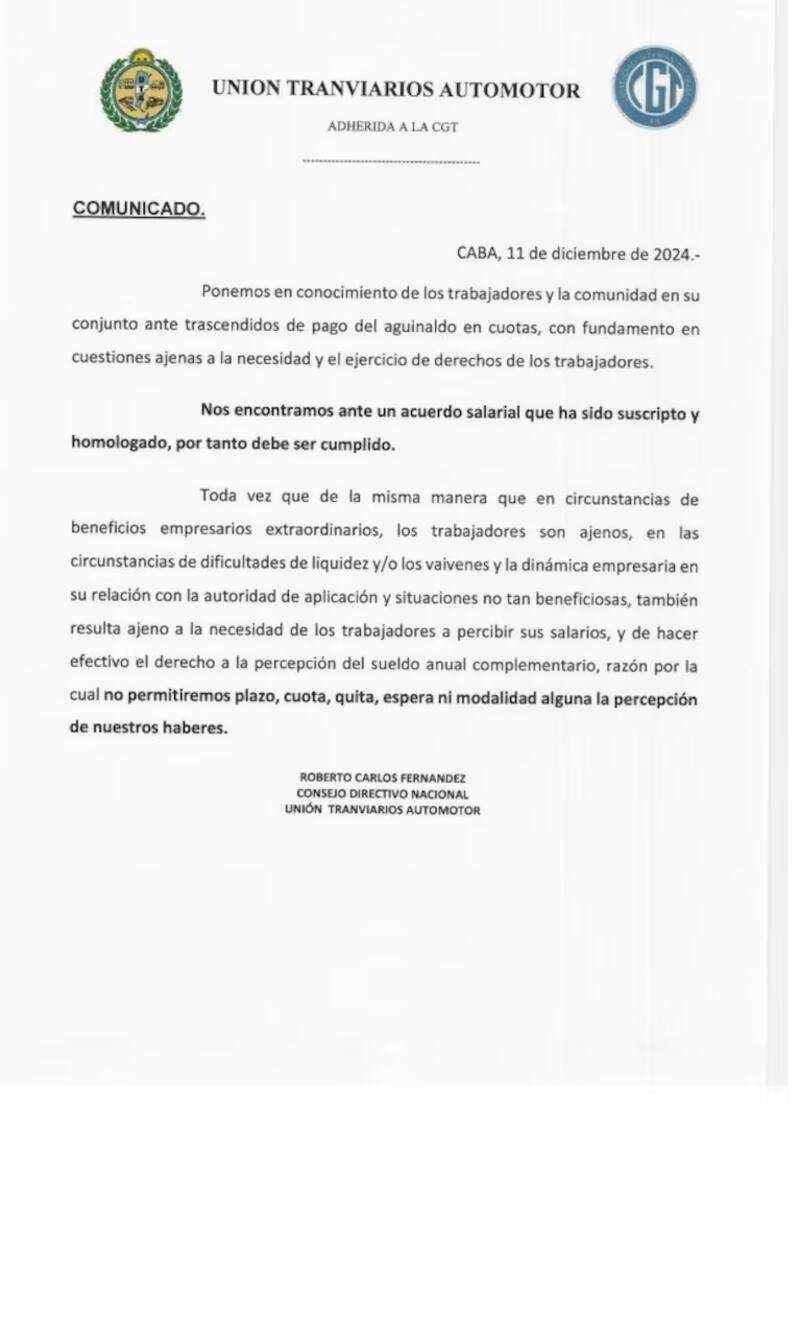 "Toda vez que de la misma manera que en circunstancias de beneficios empresarios extraordinarios, los trabajadores son ajenos, en las circunstancias de dificultades de liquidez y/o los vaivenes y la dinámica empresarial en su relación con la autoridad de aplicación y situaciones no tan beneficiosas", detallaron en el comunicado oficial.