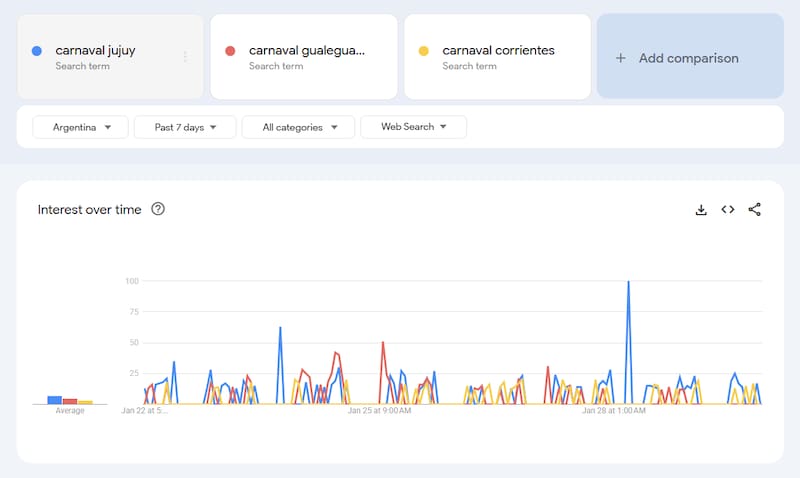 Presenta un interés mucho más estable y constante. A diferencia de los picos jujeños, las búsquedas por el carnaval entrerriano se mantienen regulares a lo largo de los días.