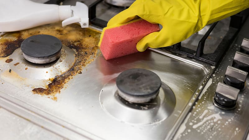 - Con una esponja, aplicar la mezcla sobre las partes sucias de la hornalla.