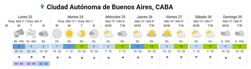 Para el martes 24, se espera que los termómetros marquen temperaturas aún más bajas que vayan desde los 1° hasta los 12° por la tarde. El miércoles y el jueves se muestran sin posibilidad de lluvias, con mínimas de 4° y máximas de 14°.