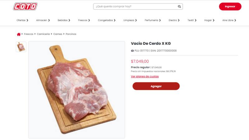 Por su parte, el vacío de cerdo a $7.049,00 está disponible en la tienda online de la cadena de supermercados de Coto y los clientes pueden consultar en los establecimientos físicos sobre la disponibilidad de dicho corte.