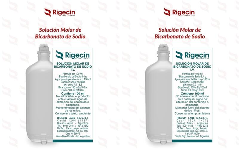 - "Solución Molar de Bicarbonato de Sodio Inyectable Rigecin / Bicarbonato de Sodio, concentración: 8.4 g/100ml, Solución Inyectable, presentación de 48 bolsa por 100 ml, lote BI0091 S2, vencimiento 12/25; Certificado N° 39.079, titularidad de la firma Rigecin Labs S.A.".