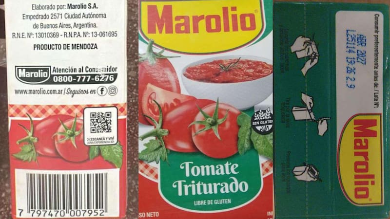 - Tomate triturado, libre de gluten, marca Marolio, Peso Neto 500g, RNPA N° 13-061695, Lote L25114 (Vto. ABR 2027), elaborado por MAROLIO SA, Empedrado 2571 Ciudad Autónoma de Buenos Aires - RNE N° 13010369 - Producto de Mendoza.