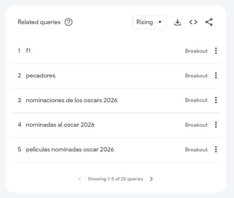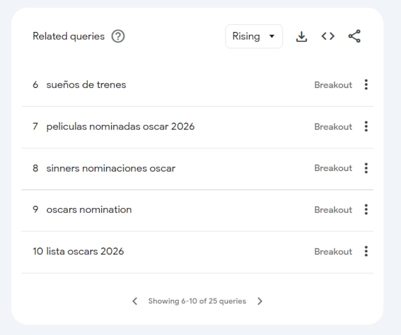 Cuando entrás a la plataforma a ver qué buscan los argentinos sobre la gran noche del cine, la herramienta exhibe una lista de “temas en aumento” que no son solo números, son las ganas de la gente por saber más.