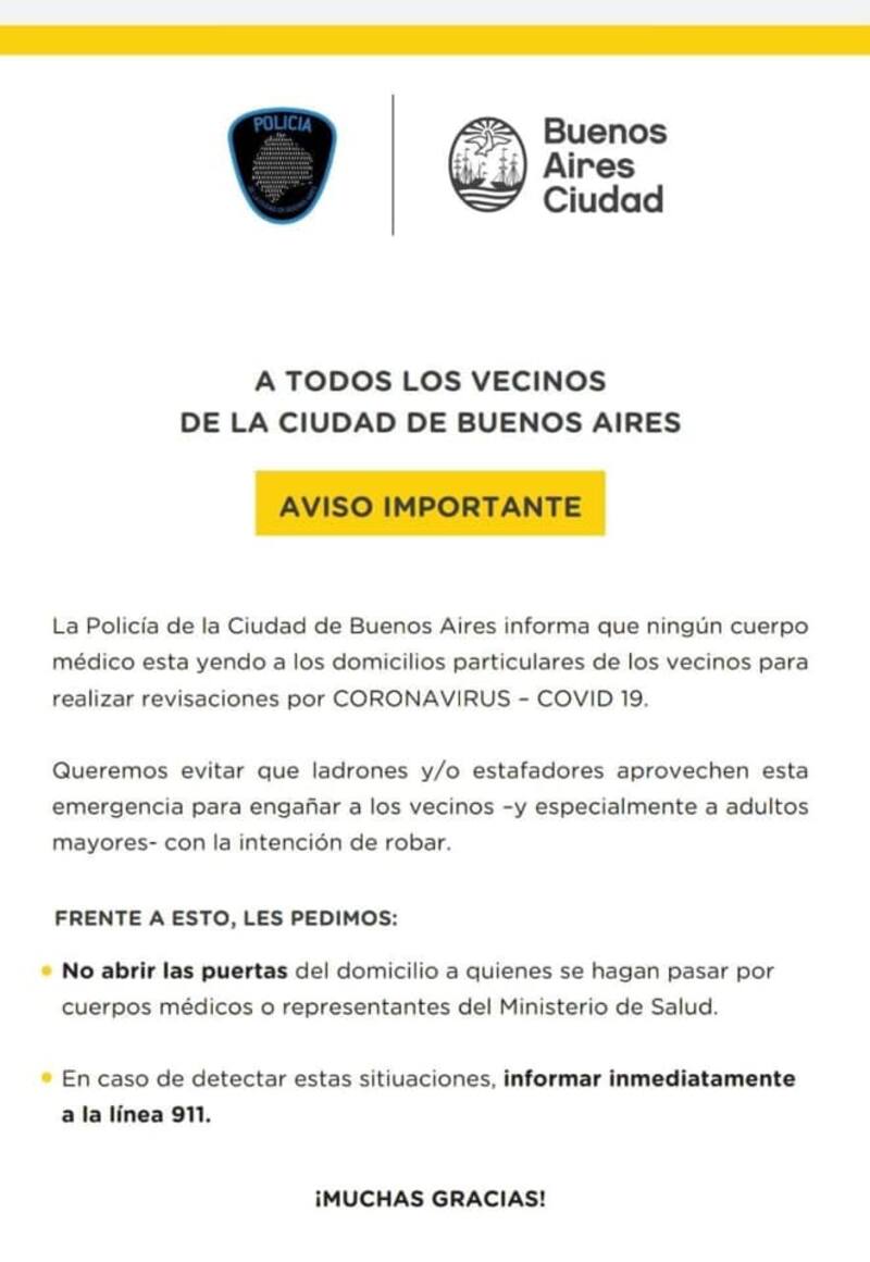 La información oficial advierte sobre posibles visitantes falsos que con la excusa de hacer revisiones a los residentes por el coronavirus obtengan acceso al domicilio. El comunicado oficial advierte que puede tratarse de ladrones y exhorta a los ciudadanos a llamar inmediatamente al 911 de procudirse un caso como este. Por el momento, sin embargo, no se registra ningún caso y desde Seguridad de la Ciudad comentaron que se trata de una "medida preventiva".