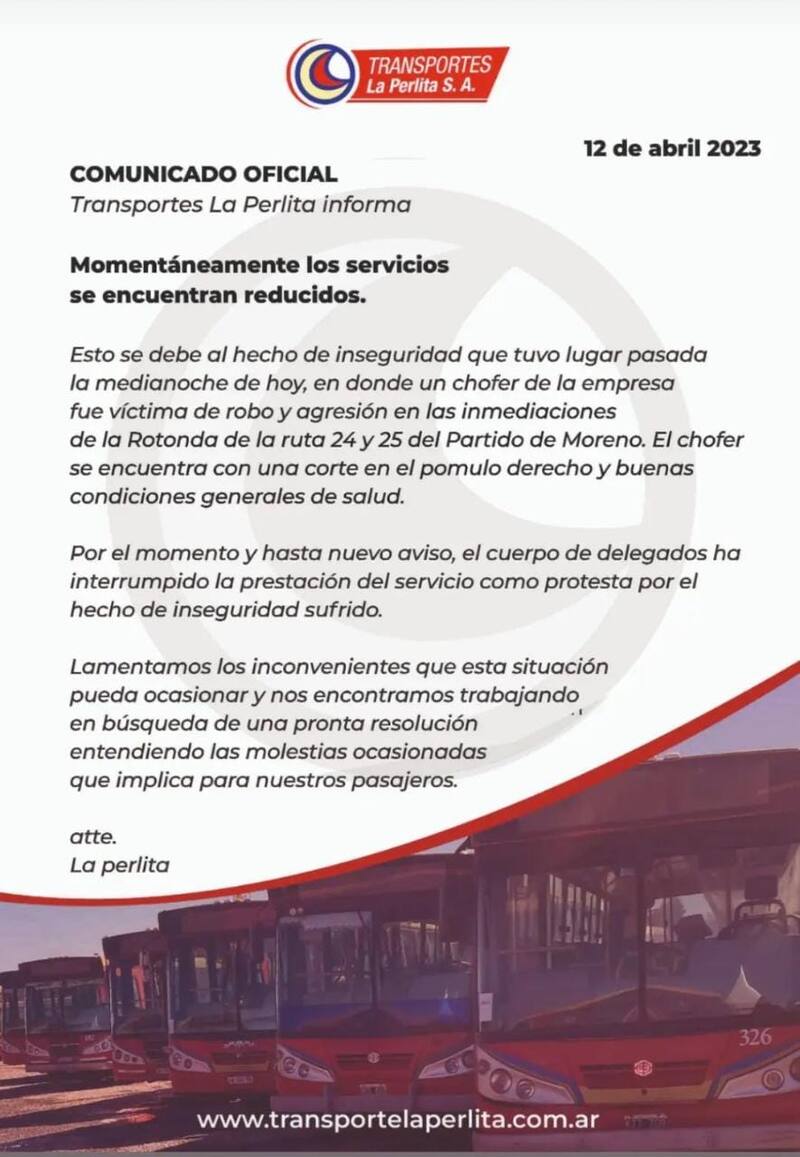 "Momentáneamente los servicios se encuentran reducidos. Este se debe al hecho de inseguridad que tuvo lugar pasada la medianoche de hoy, en donde un chofer de la empresa fue víctima de un robo y agresión en las inmediaciones de la Rotonda de la ruta 24 y 25 del Partido de Moreno", informó la compañía a través de un comunicado.