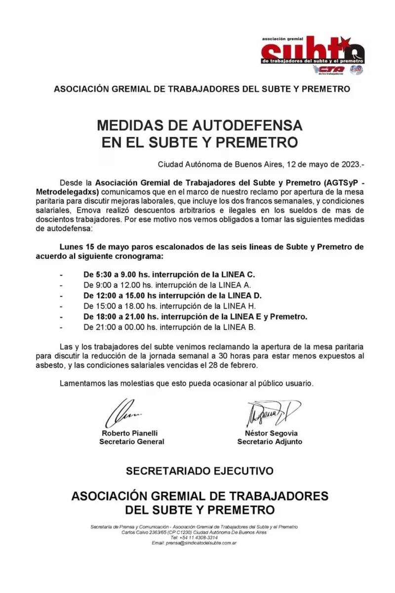 Este lunes 15 de mayo la Asociación Gremial de Trabajadores del Subte y el Premetro (AGTSyP) lleva a cabo un nuevo paro del servicio que se extenderá durante todo el día y afectará a todas las líneas de manera escalonada.