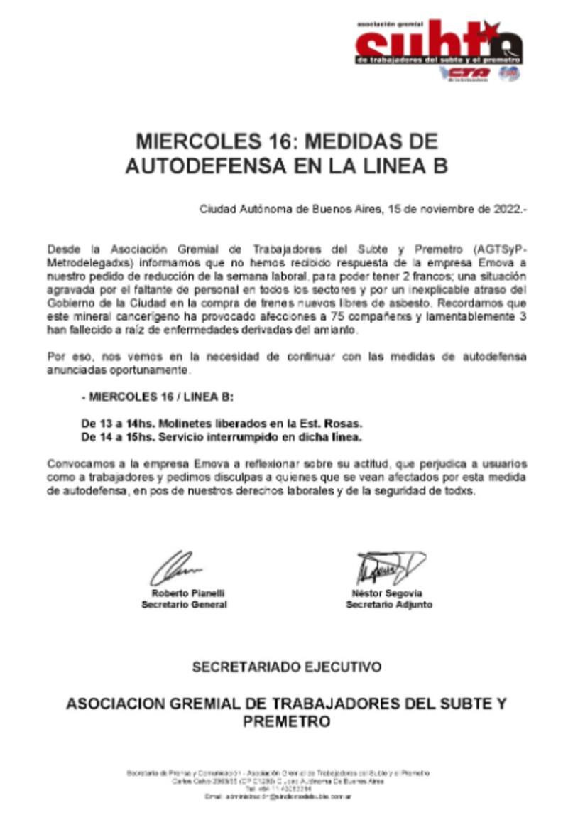 La Asociación Gremial de Trabajadores del Subte y Premetro (AGTSyP-Metrodelegados) confirmó que este miércoles aplicará nuevas medidas de fuerza ante la "falta de respuesta" de la empresa Emova, tras un pedido presentado por los trabajadores que contempla la reducción de la semana laboral.