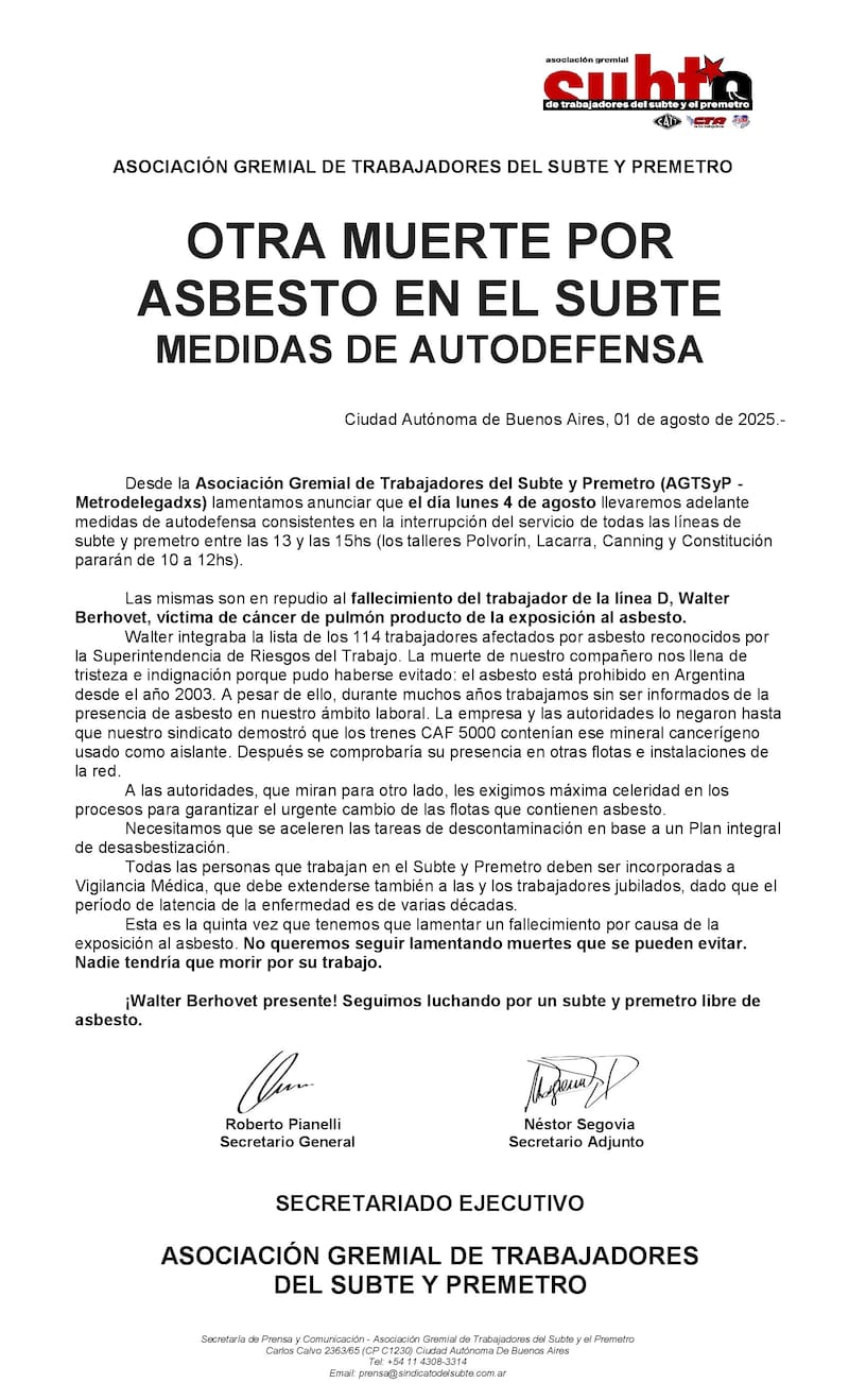 Previo al reclamo, el gremio había explicado que la decisión fue adoptada en repudio al fallecimiento del trabajador de la línea D, Walter Berhovet, víctima de cáncer de pulmónproducto de la exposición al asbesto.