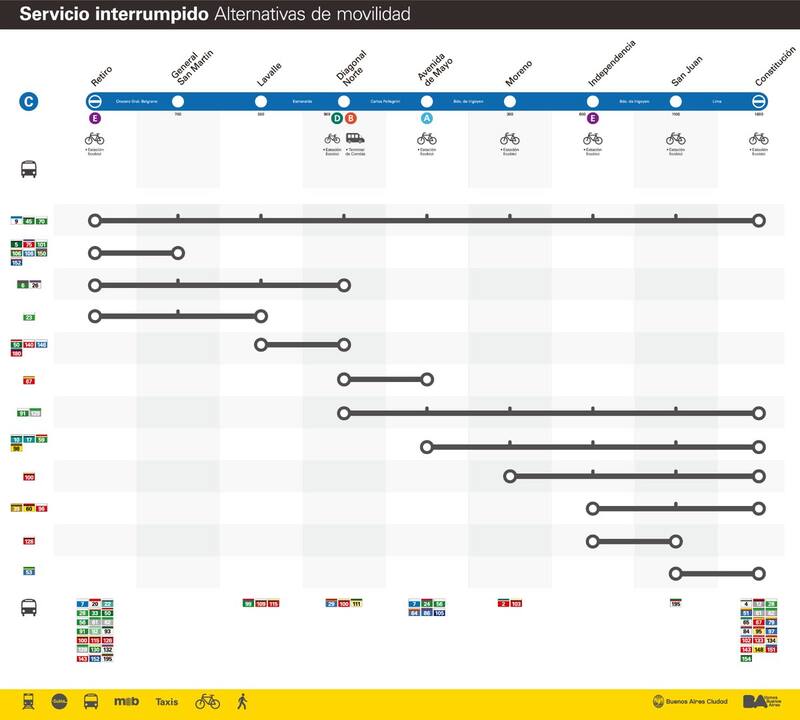 Debido al paro de subtes que afecta a la línea Cdesde las 5.30 hasta las 9.00, estas son las alternativas para viajar en colectivo: