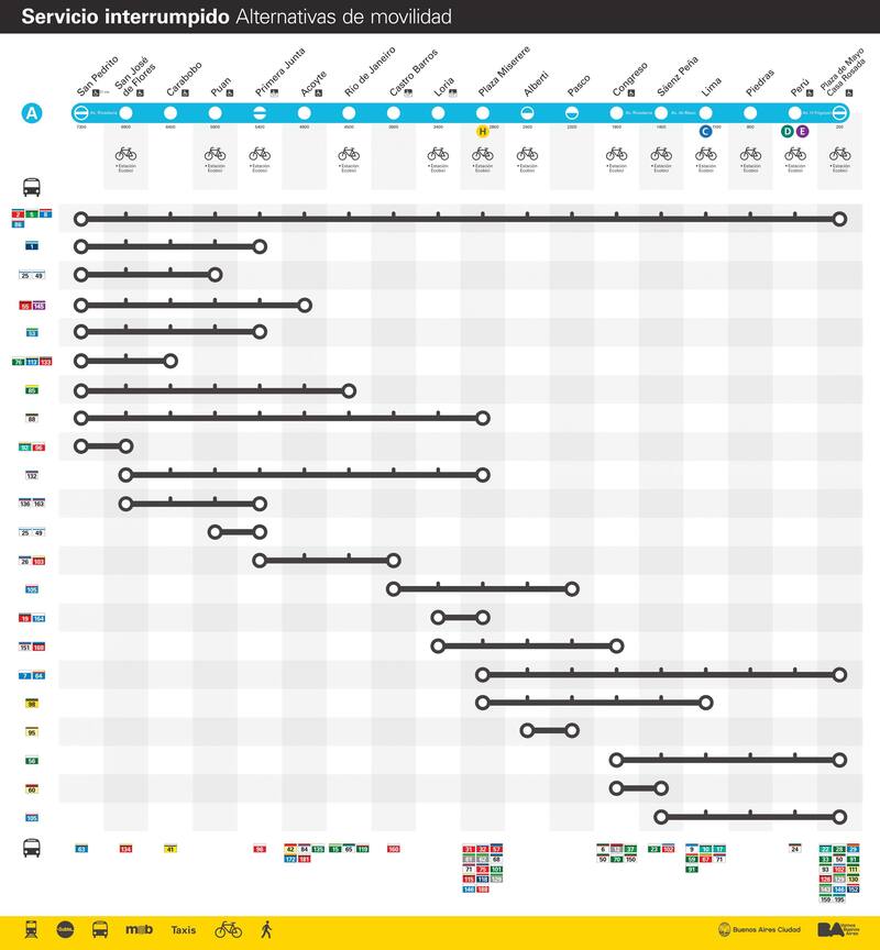 Desde la Secretaría de Transporte y Obras Públicasde la Ciudad compartieron alternativas de viaje en colectivopara quienes debían viajar en la línea A, que se encuentra interrumpida por el paro desde las 9.00 hasta las 12.00 del medio día