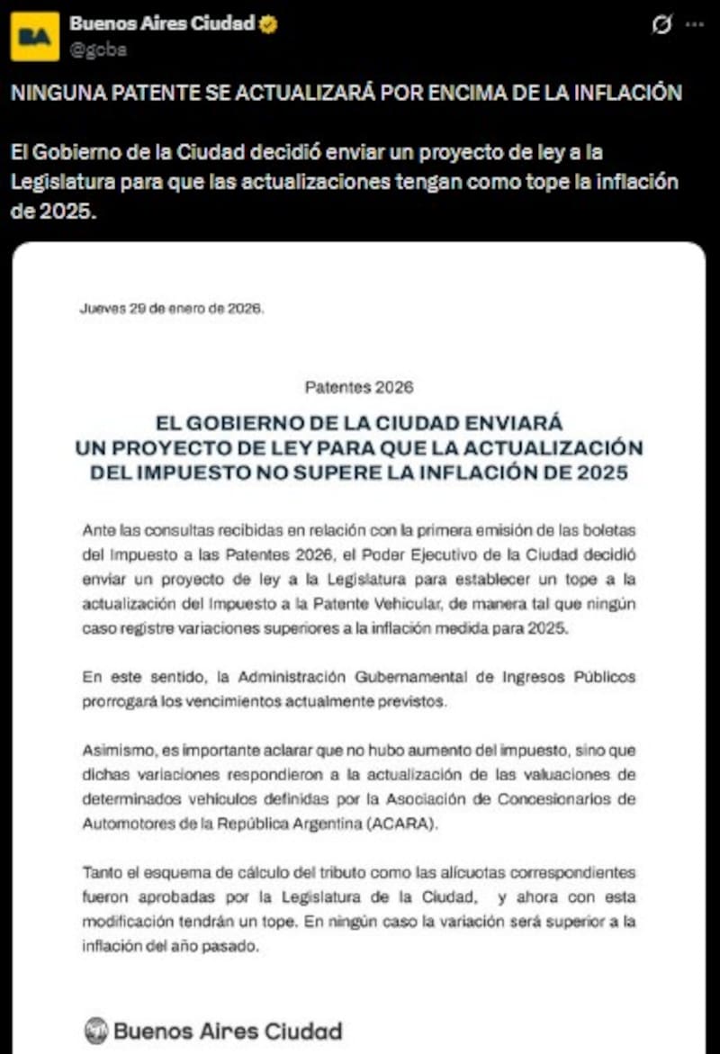A raíz de las criticas, la administración porteña a cargo de Jorge Macri presentará una iniciativa para poner un límite a futuras subas. “Ante las consultas recibidas en relación con la primera emisión de las boletas del Impuesto a las Patentes 2026, el Poder Ejecutivo de la Ciudad decidió enviar un proyecto de ley a la Legislatura para establecer un tope a la actualización del Impuesto a la Patente Vehicular, de manera tal que ningún caso registre variaciones superiores a la inflación medida para 2025″, sostuvo el comunicado.