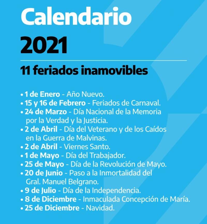 El Gobierno estableció que en 2021 hay 18 días no laborables y que los feriados 'puente' serían en mayo, octubre y noviembre, de acuerdo al Decreto 947/2020, publicado el 26 de noviembre pasado. Sin embargo, ahora se eliminó uno de ellos, el lunes 24 de mayo, la previa de la jornada que a la Revolución de Mayo, para no alentar el turismo en plena segunda ola de coronavirus. A su vez, para reponer el feriado puente perdido, se pondría otro el 16 de agosto.