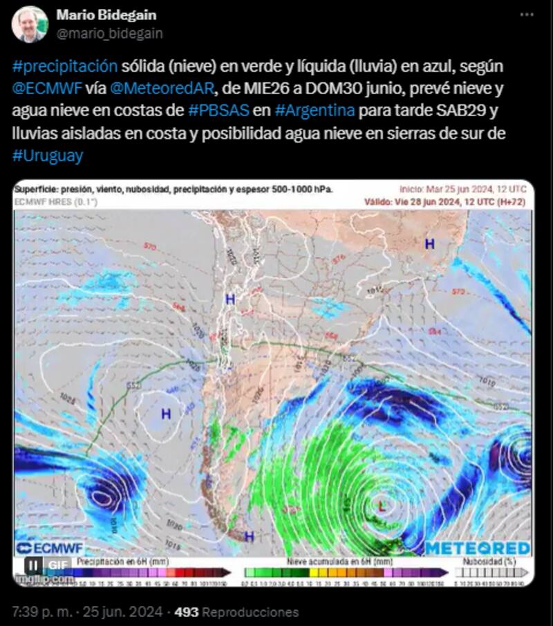 El meteorólogo Mario Bidegain estimó que desde este miércoles al domingo se prevé nieve y agua nieve en la costa bonaerense.