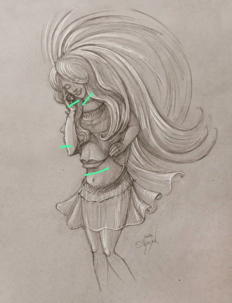 Para que no te quedes con la duda, aquí va la solución del desafío mental del día de hoy. La primera es la que mencionamos y se ve a simple vista. La segunda está en el brazo derecho de la mujer. La tercera solo muestra una parte del rostro y aparece en la extremidad superior derecha junto a la cara.