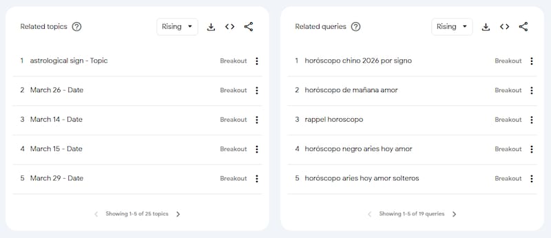 En las consultas relacionadas al horóscopo que pueden verse en la siguiente imagen, Google Trends exhibe qué temas acumularon más búsquedas en el período de tiempo analizado que, en nuestro caso, abarca los primeros tres meses del 2026.
