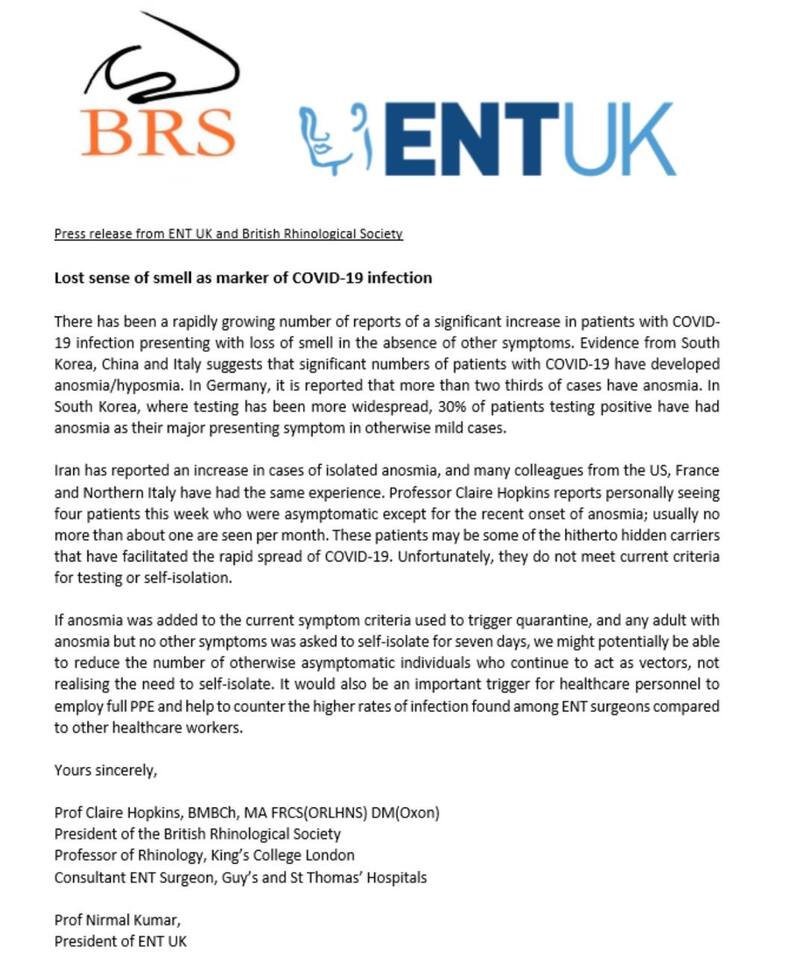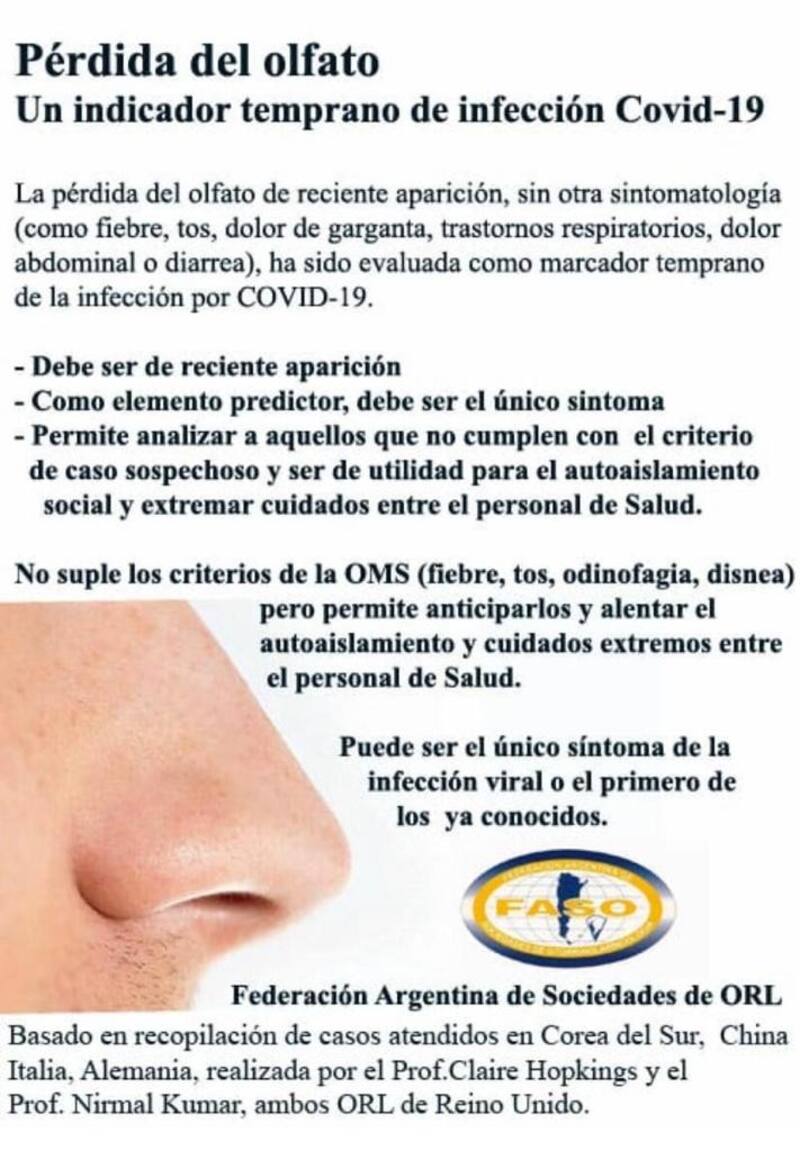 "La pérdida del olfato de reciente aparición, sin otra sintomatología (como fiebre, tos, dolor de garganta, trastornos respiratorios, dolor abdominal o diarrea), ha sido evaluada como marcador temprano de la infección por Covid-19", indica el comunicado que se puede leer en el sitio web, donde se bajan recomendaciones para el tratamiento de la pandemia.