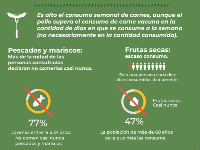 Las principales carencias que se ven en el informe son en la variedad de esta elección de carne: los resultados revelaron un alto consumo vacuno y de pollos, pero bajos niveles en cerdos y aun menores en pescados y mariscos, algo que no es tan usual en la dieta argentina.