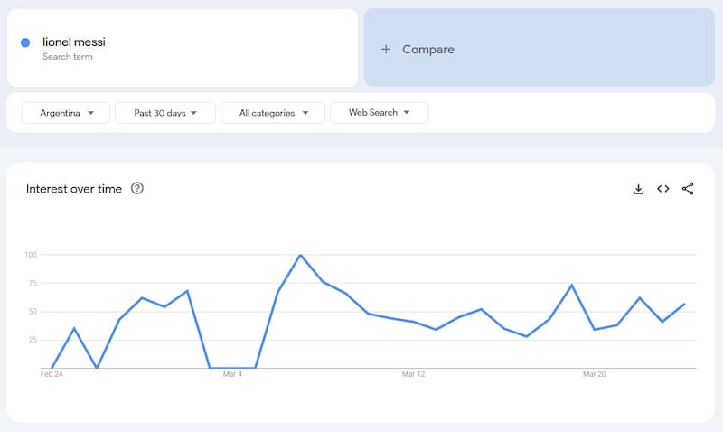El gráfico de “Interés a lo largo del tiempo” mostró una actividad constante con picos pronunciados que coincidieron con sus presentaciones en la MLS y la cercanía de las fechas de eliminatorias.