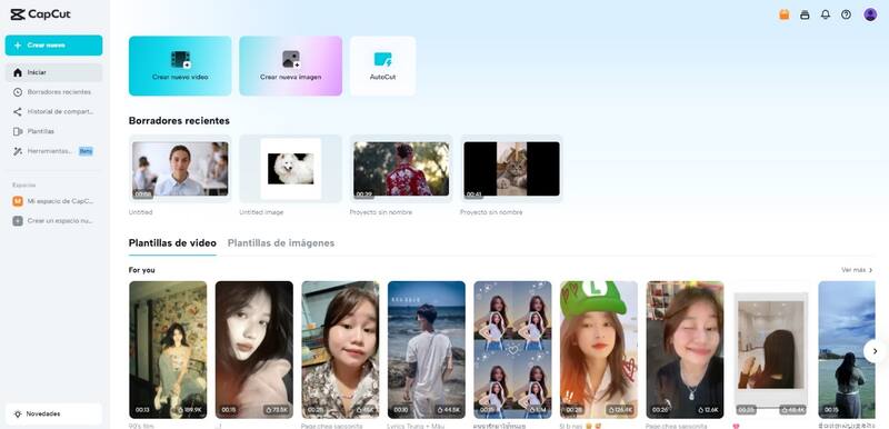 Al abrir la página web principal de CapCut nos encontraremos con una interfaz donde podemos empezar directamente a trabajar con plantillas predefinidas, o donde podemos seleccionar el tipo de video con el que queremos trabajar desde cero. Acá también tendremos acceso a nuestros borradores más recientes para continuar nuestro trabajo, así como los espacios compartidos en los que podremos trabajar colectivamente con otros usuarios.