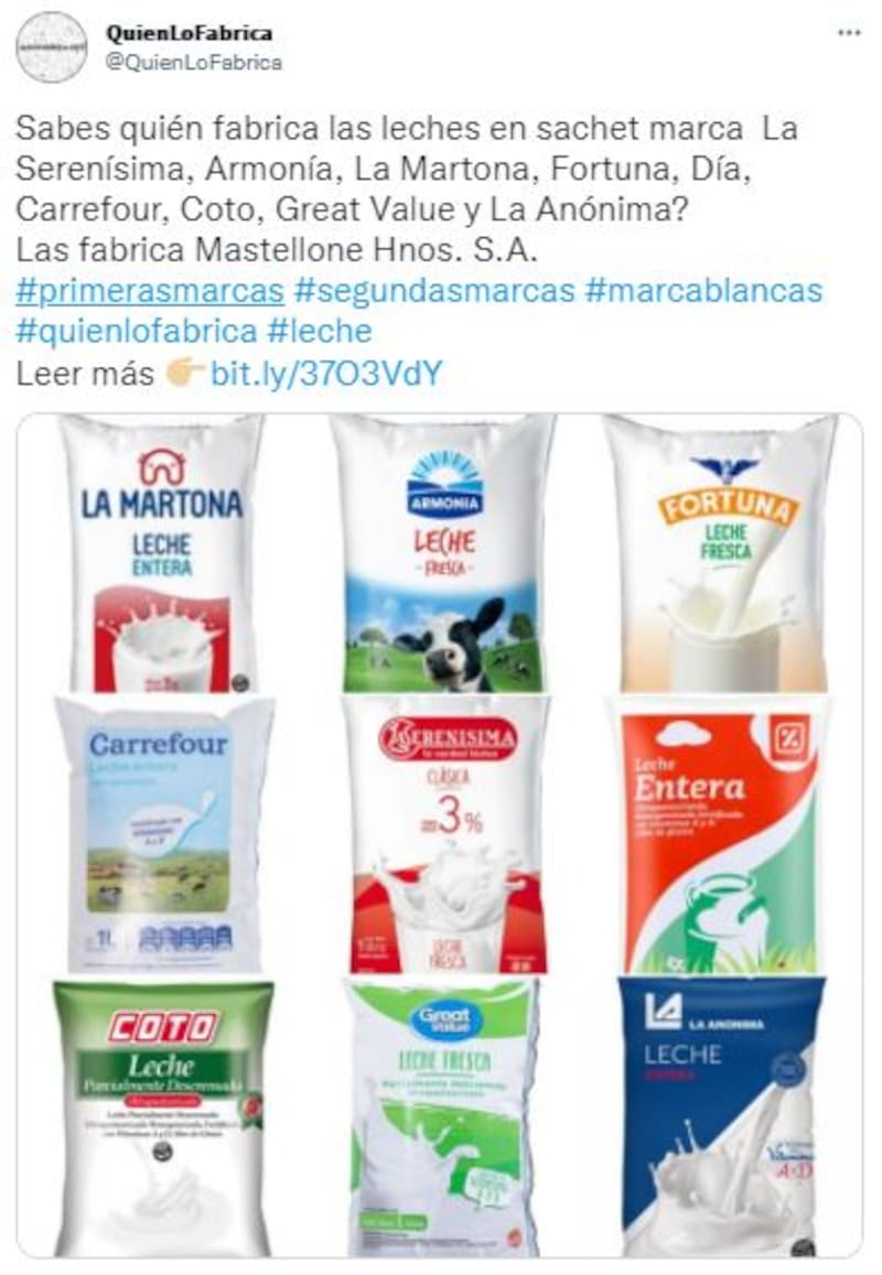 Por ejemplo, recientemente armaron una publicación en la que explican que las leches sachet marca La Serenísima, Armonía, La Martona, Fortuna, Día, Carrefour, Coto, Great Value y La Anónima son todas producidas por la empresa Mastellone Hermanos S.A., mientras que los alfajores Vimar, Día, Día Mousse, Escolar, Trassens, Cuquets y Golazooo son todos producidos por la empresa Toray S.A.