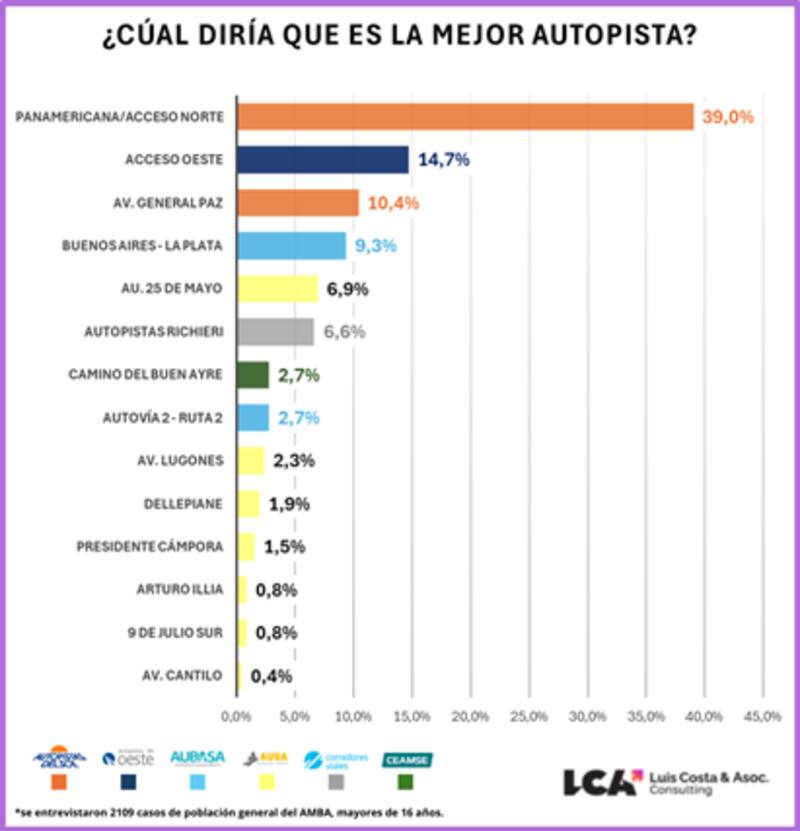 La Panamericana fue seguida en las preferencias por la Autopista del Oeste/Acceso Oeste con un 14,7% de respuestas positivas. En tanto la Avenida General Paz completó el podio con un 10,4%.