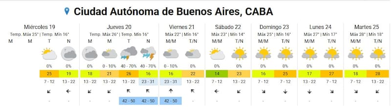 Desde la página oficial del SMN alertaron que durante la noche del miércoles 19 se gestará una fuerte tormenta que llegará a Buenos Aires durante la noche del jueves. Se espera hasta un 70% de probabilidades de lluvias, mientras que la temperatura máxima se mantendrá en torno a los 26°.