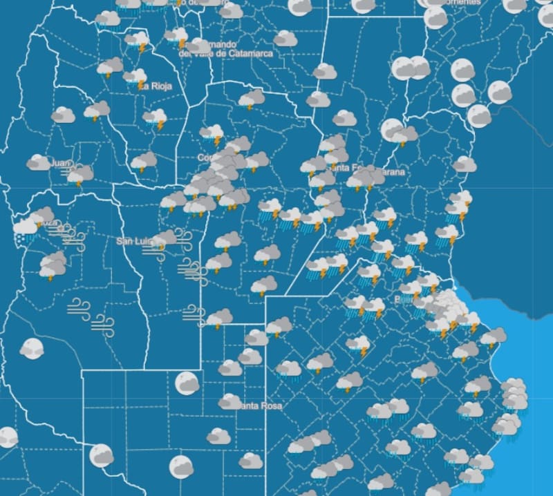 En la misma línea, se pronostican precipitaciones en Entre Ríos, Santa Fe, Córdoba, La Rioja, Catamarca, Jujuy y Mendoza. En esta última provincia, se espera caída de granizo en las zonas aledañas a Punta de Vacas.