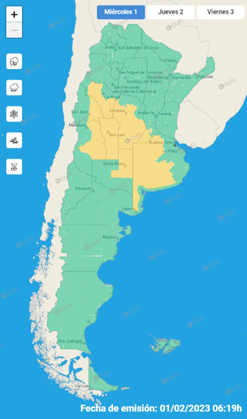 El SMN informó que la alerta meteorológica se extiende a 9 provincias: Buenos Aires, Catamarca, Córdoba, La Pampa, La Rioja, Mendoza, San Juan, San Luis y Santa Fe.