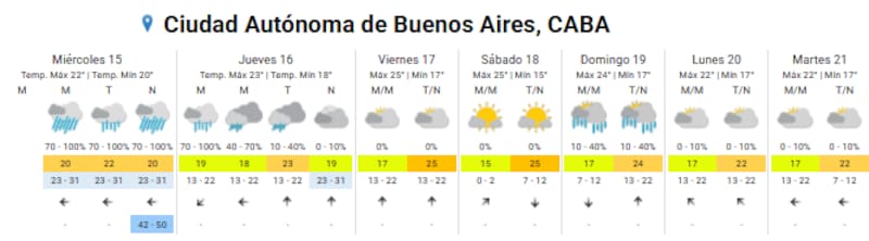 - Miércoles 15: mínima de 20 °C y máxima de 22 °C, con lluvias fuertes y ráfagas de viento de hasta 50 km/h.