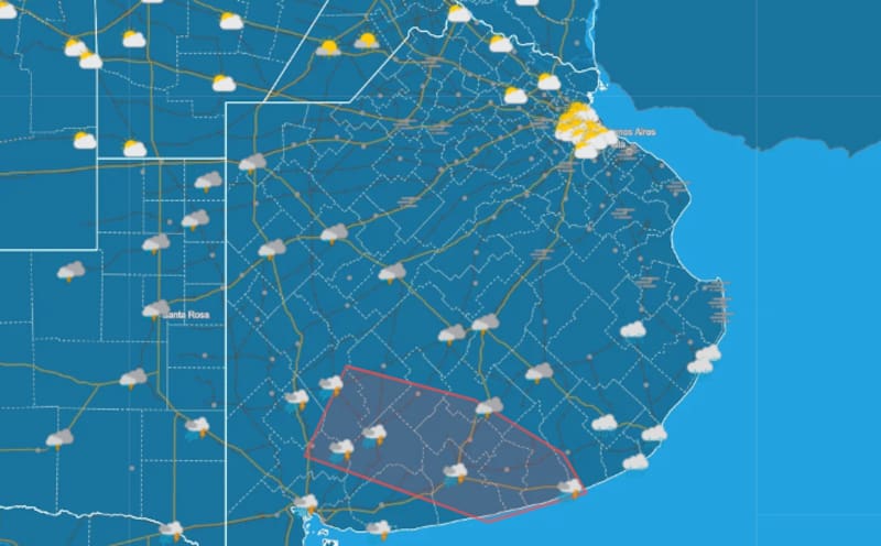 El Servicio Meteorológico Nacional emitió una alerta roja por tormentas fuertes con lluvias intensas para este martes en varias localidades bonaerenses, entre ellas A. Gonzales Chaves, Benito Juarez, Cnel Dorrego, Cnel Suarez, Crel Pringles, Gral Lamadrid, Laprida, Loberia, Necochea, Saavedra, San Cayetano, Tornquist y Tres Arroyos.