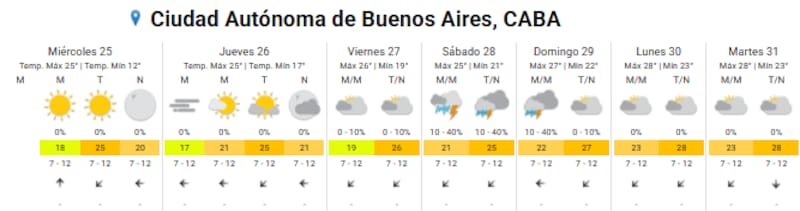 - Miércoles 25: mínima de 12°C y máxima de 25°C, con cielo despejado.