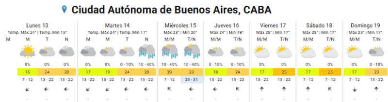 - Lunes 13: mínima de 15°C y máxima de 24°C, con el cielo mayormente nublado.