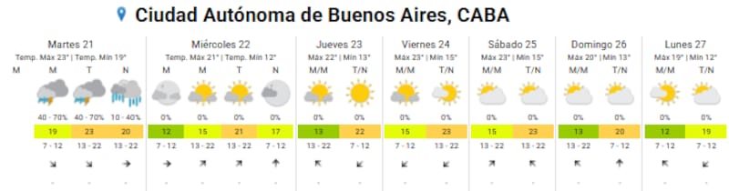 - Martes 21: mínima de 19°C y máxima de 23°C, con tormentas aisladas hasta la tarde y chaparrones por la noche.