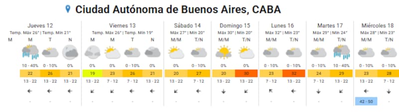 Si bien gran parte de la provincia registrará lluvias desde el fin de semana, la Ciudad de Buenos Aires comenzará a sentirlas con mayor intensidad a comienzos de la próxima semana. El SMN difundió el siguiente pronóstico extendido para CABA: