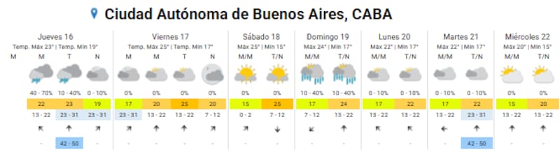 - Domingo 19: mínima de 18°C y máxima de 23°C, con tormentas fuertes durante todo el día.