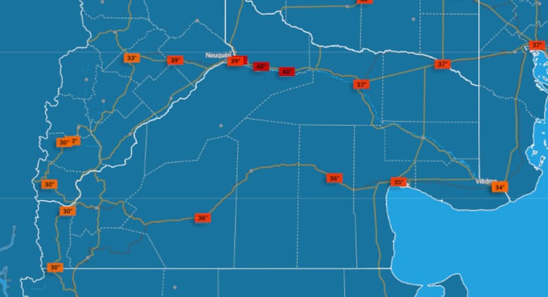 Según el mapa del SMN, las localidades más afectadas serán Cipolletti, General Roca, Villa Regina, Choele Choel, Río Colorado y Valcheta. Además, el calor se extenderá a Neuquén y Cutral Co.