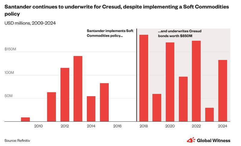 Global Witness analizó datos públicos sobre las emisiones de bonos de Cresud desde 2009. Allí, Santander es el principal suscriptor de 35 de los 47 bonos emitidos por la compañía desde 2002, y los consorcios liderados por el banco representan más del 90% del valor total en dólares de los bonos emitidos por la compañía.