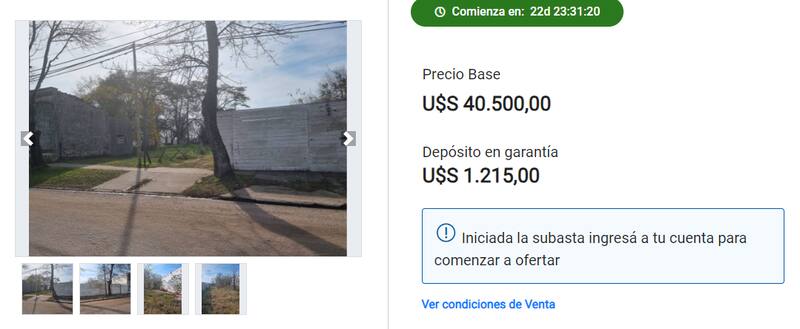 El precio de base iniciará en u$s 40.500. Para poder participar se deberá efectuar un depósito de garantía de u$s 1215. El terreno cuenta con cerco perimetral de madera en su frente y uno de sus laterales.