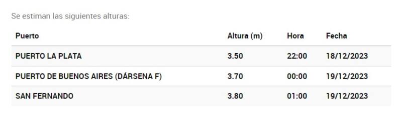 Según señaló Defensa Civil Bonaerense, entre la noche del lunes y la madrugada se esperaba 3,50 metros de crecida en el puerto de La Plata, 3,70 en San Fernando y 3,60 en el Puerto de Buenos Aires.