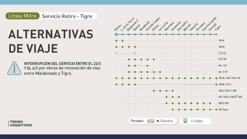Las autoridades de Trenes Argentinos informaron que un ramal de la línea Mitre tendrá servicio reducido entre el sábado 22 de febrero y el martes 4 de marzo.