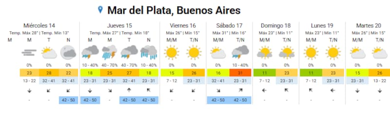 - Miércoles 14: mínima de 13° y máxima de 28°, niebla por la mañana y el cielo parcialmente nublado, con ráfagas de viento de hasta 50 km/h por la noche.