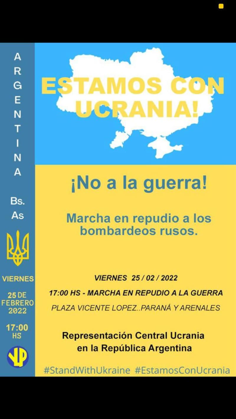 Bajo el lema "Estamos con Ucrania. No a la guerra" la colectividad ucraniana se movilizará esta tarde a las 17 en Buenos Aires, con una convocatoria a la Plaza Vicente López, en Paraná y Arenales, en esta capital.