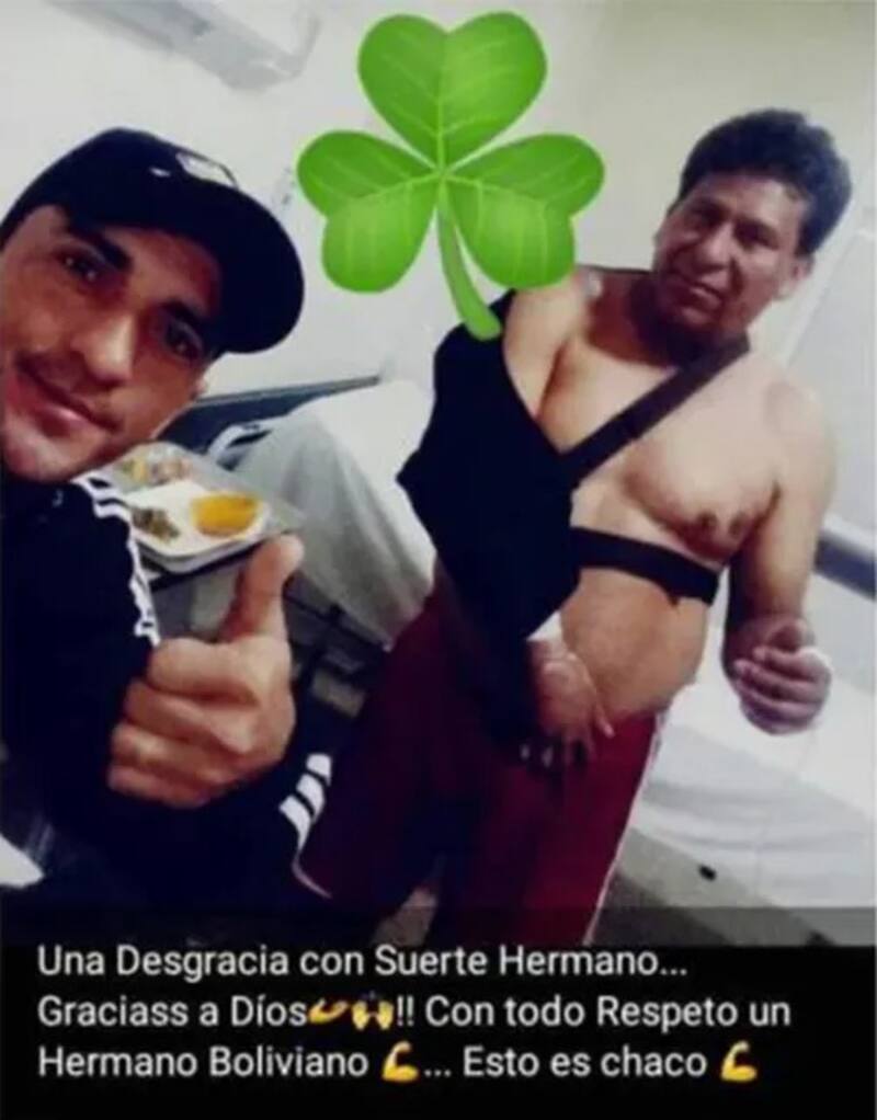 "Hola, buenos días. Quiero hacer llegar esto a los hermanos bolivianos, lo que le pasó a este hombre (por él mismo), antes de llegar a Tartagal (Salta) límite con Chaco. Quería hacerle saber a toda la comunidad de Bolivia y, especialmente, a los hospitales y centros de salud pública, que este señor (por él mismo) fue muy bien atendido acá en Chaco, Argentina... Para que cuando tengan que atender a un argentino, tengan en cuenta que acá no se lo discrimina, señores. Como cuando lo hicieron aquella vez con un paciente argentino y lo dejaron morir... Nada más quería hacer llegar esto a nuestro país vecino... Gracias", dice el posteo que realizó el camionero llamado Sergio Kronemberguer, junto con la siguiente imagen.