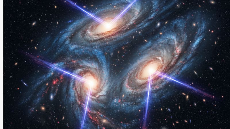 El sistema, identificado como J1218/1219+1035, se encuentra a unos 1.200 millones de años luz de la Tierra y está compuesto por tres galaxias en proceso de fusión, cada una con un núcleo galáctico activo.